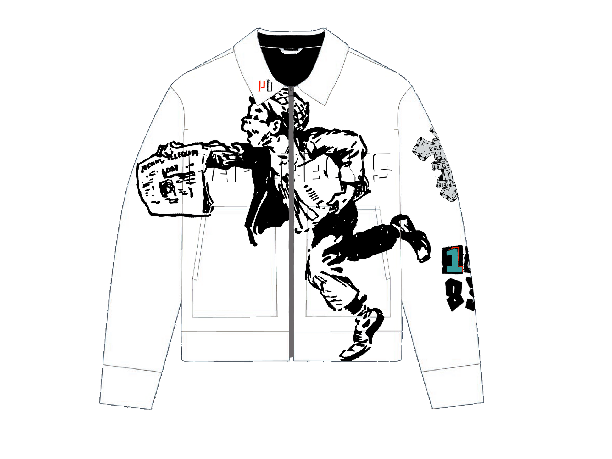 This premade jacket design features a striking graphic of a paper boy on the front, complemented by detailed graphics along the sleeves. Ideal for streetwear brands or fashion lines, this design is available for resale with all brand names fully adjustable upon request.